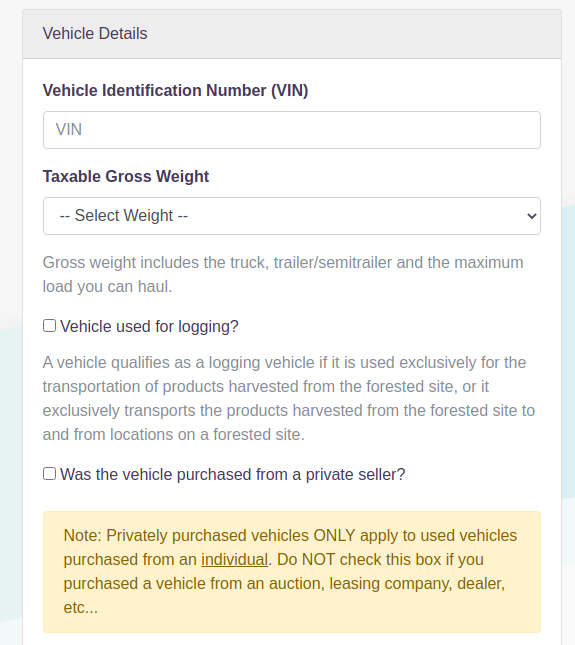 The system will walk you through each step of the process including where to add your vehicle identification numbers (VIN). You will start by selecting the tax year, entering your vehicle information, including the VIN (Vehicle Identification Number), taxable gross weight, and the month first used date. You can add multiple vehicles on a single 2290 filing.